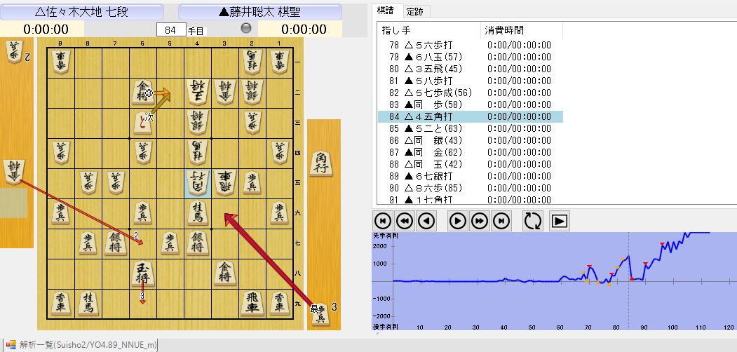 84手目45角打ち  次で、AI(水匠2)により<最善手>を分析します。