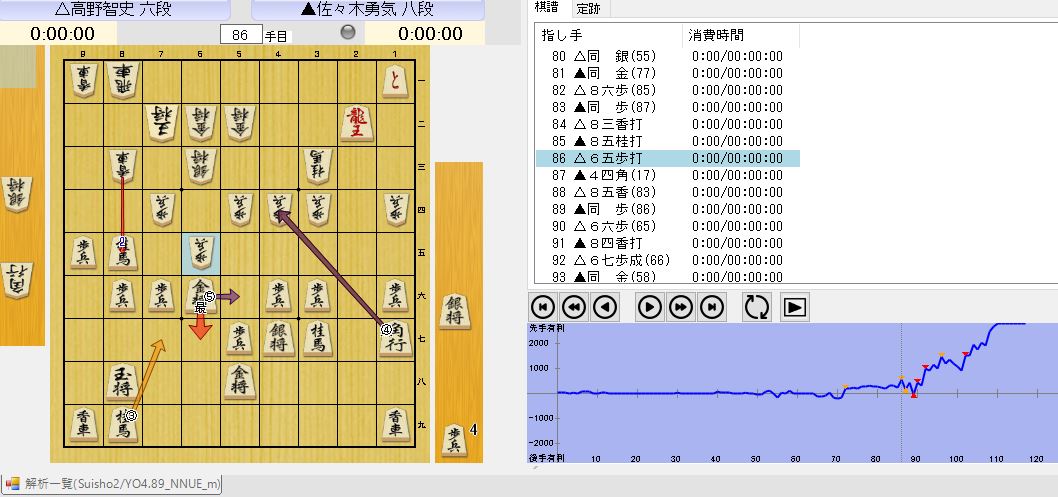 86手目65歩  次で、AI(水匠2)により<最善手>を分析します。