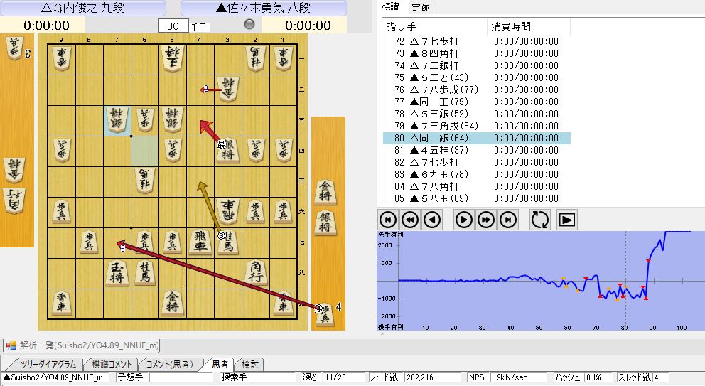 80手目73同銀次に、AIにより《最善手》を解析します。