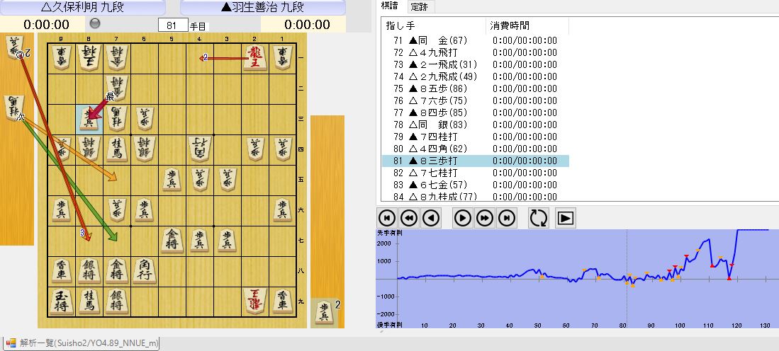 81手目83歩打ちで、AI(水匠2)により<最善手>を分析します。