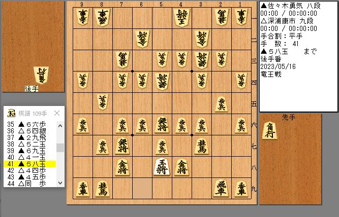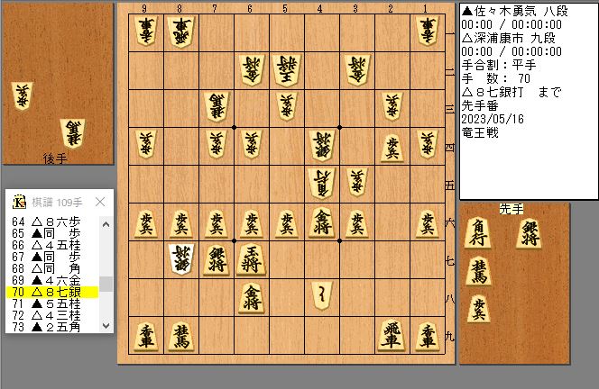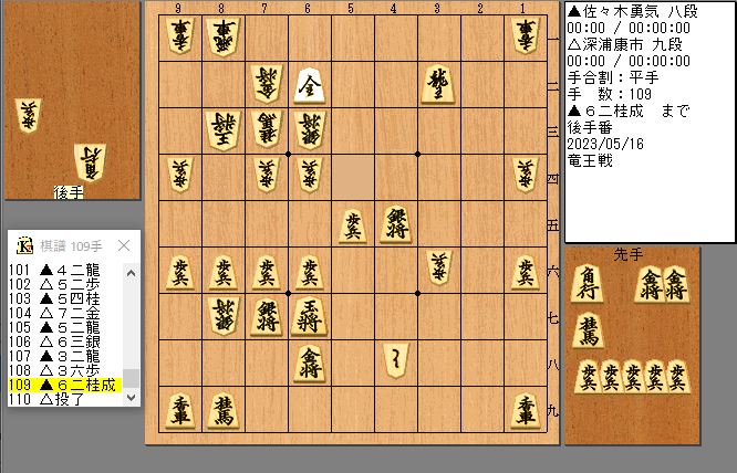 先手・佐々木八段が4五銀と後手の金を取って落ち着いて勝ちを手にしました。後手は珍しく悪手が多めで飛車が気の毒に見えます。