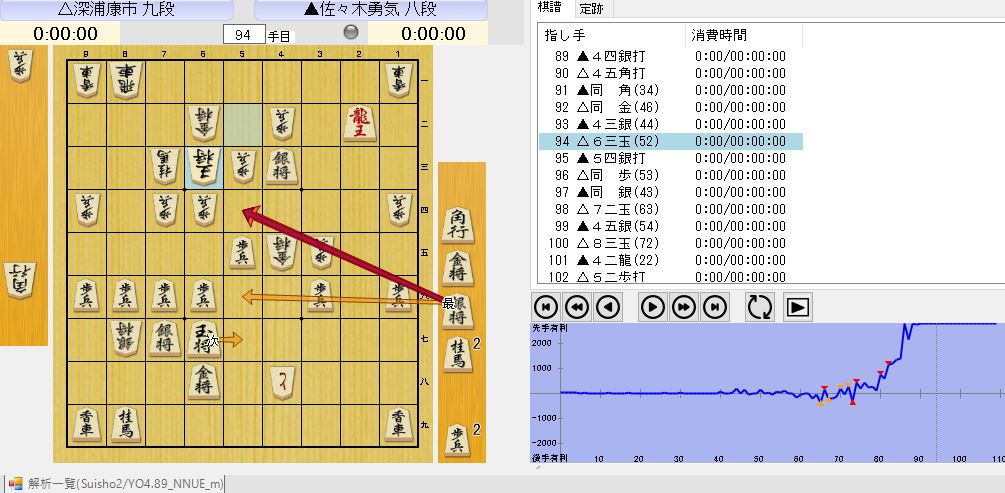 80手目73同銀 次に、AIにより《最善手》を解析します。